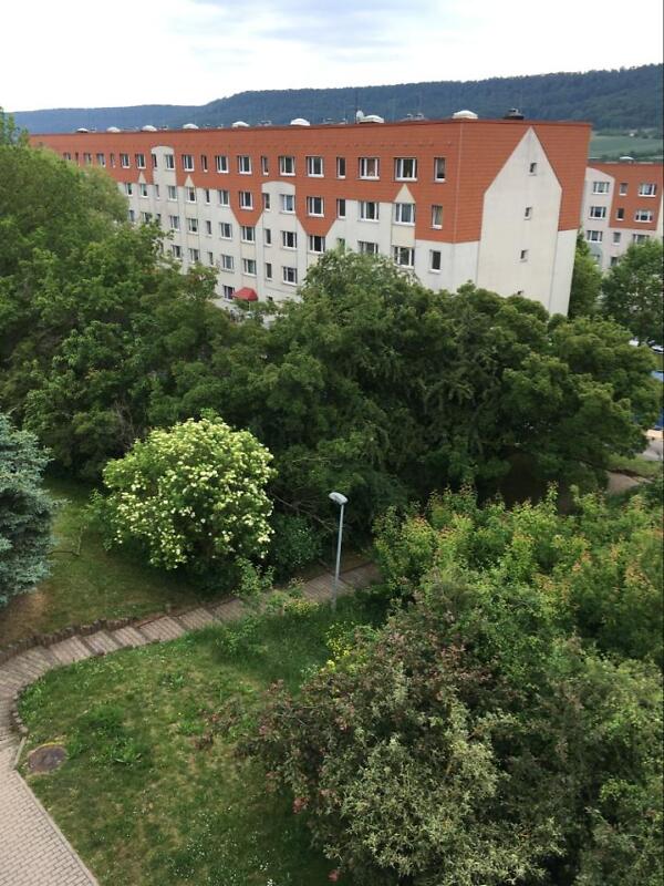 Ein Blick aus dem Fenster zeigt den Weg zum Wald, der ca. 15 min. Fußweg von der Wohnung entfernt ist, während ein Gang auf den Balkon an der Südseite das Gefühl vermittelt im Grünen zu stehen, da das Haus von vielen Bäumen umgeben ist.